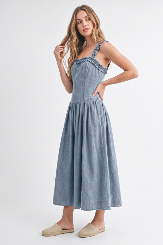 The Amelia Clementine Ruffle-Strap Denim Midi Dress