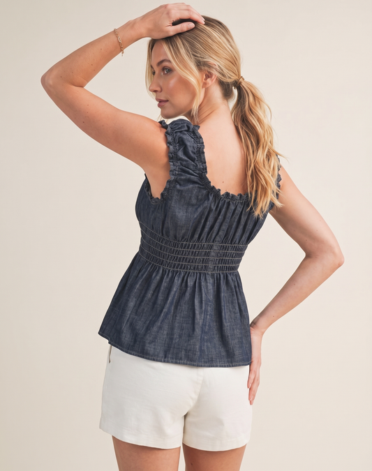 The Jolene Smocked Ruffle-Strap Denim Top (Copy)