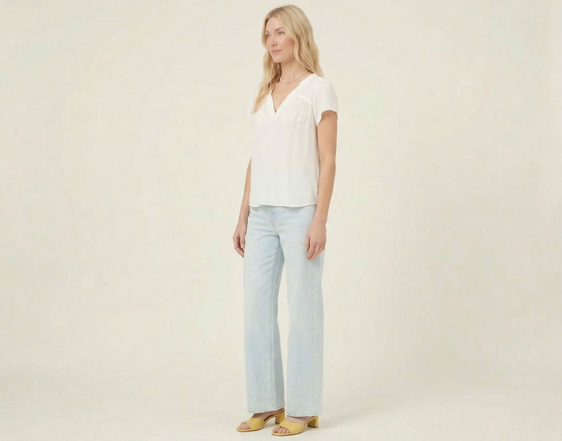 The Bottoms: A pair of ultra light-wash, wide-leg denim jeans with a high waist.