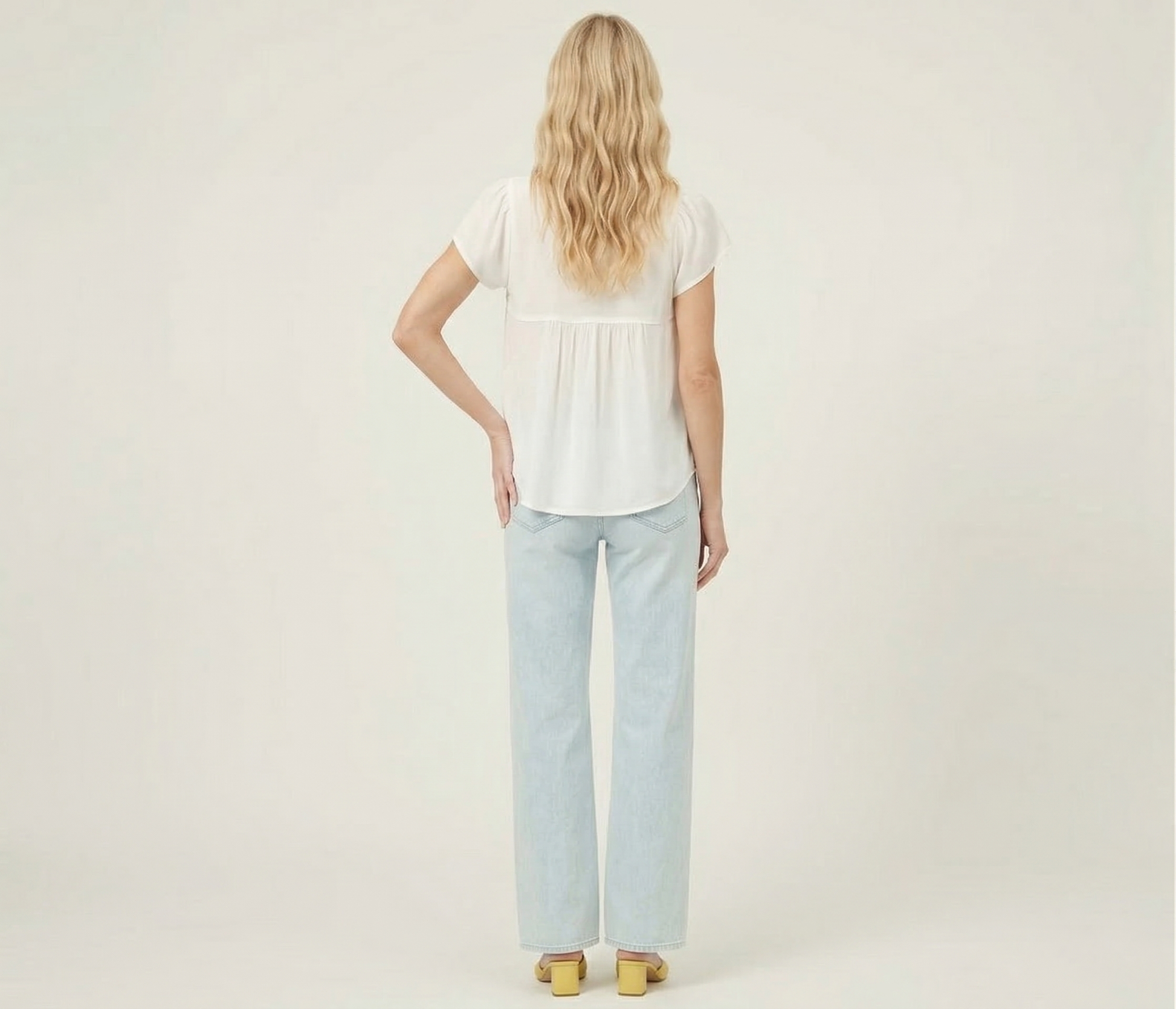 The "Clean Aesthetic": Pair with light-wash wide-leg jeans (as shown) and a pop-of-color heel for a fresh, modern daytime look.