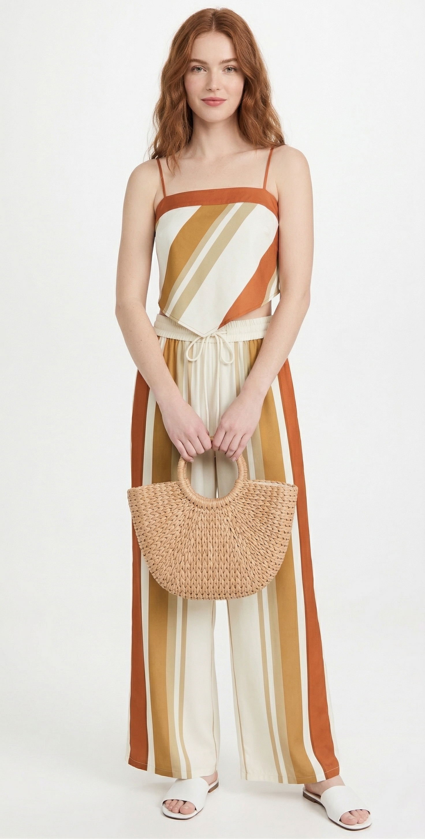Chase the sun in our Solstice Striped Tie-Back Set. Featuring a chic hankie-hem crop top with a dramatic bow back and matching high-waisted wide-leg pants, this retro-inspired co-ord is your ultimate summer getaway uniform. Lightweight, adjustable, and undeniably bold.
